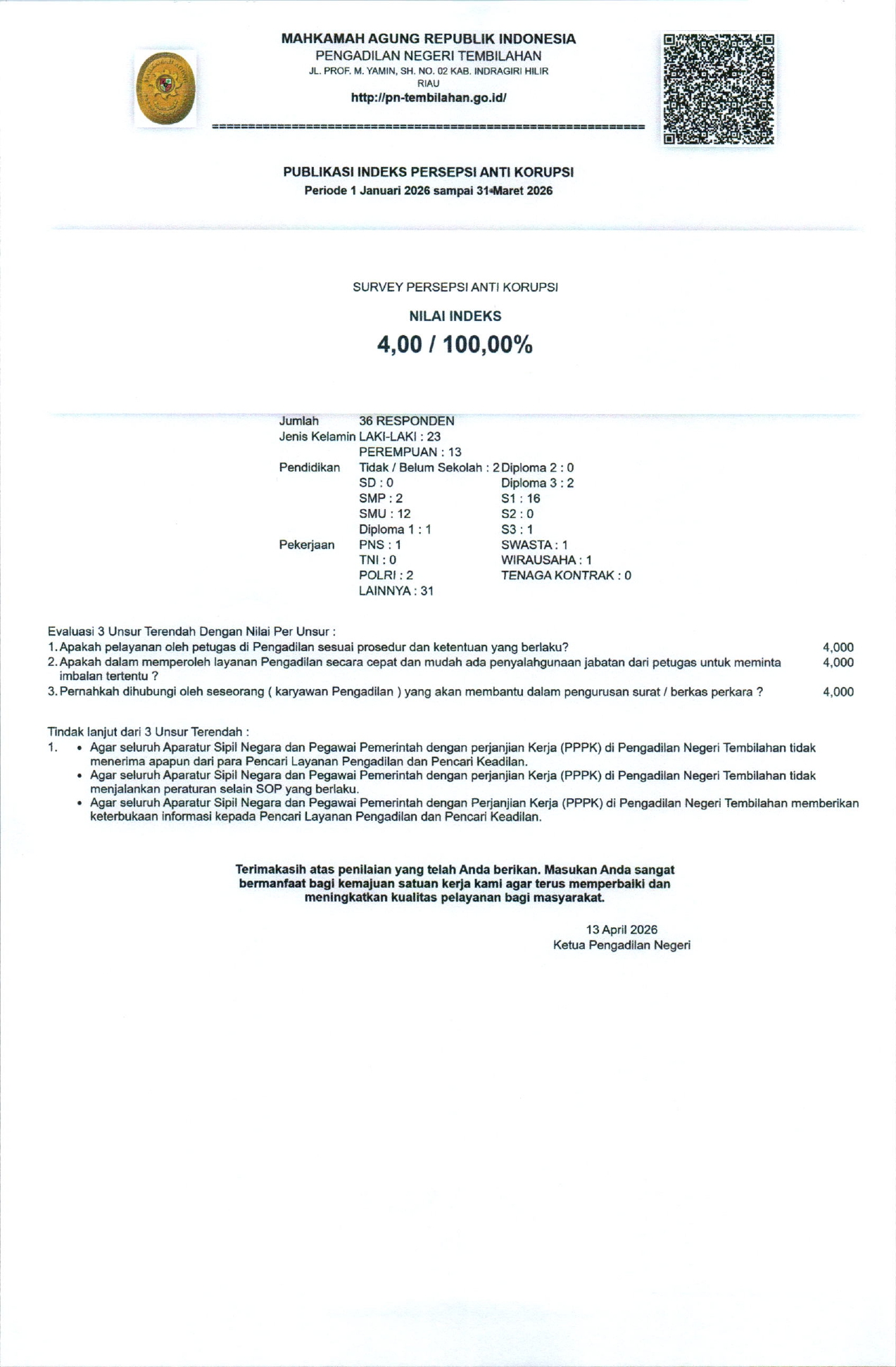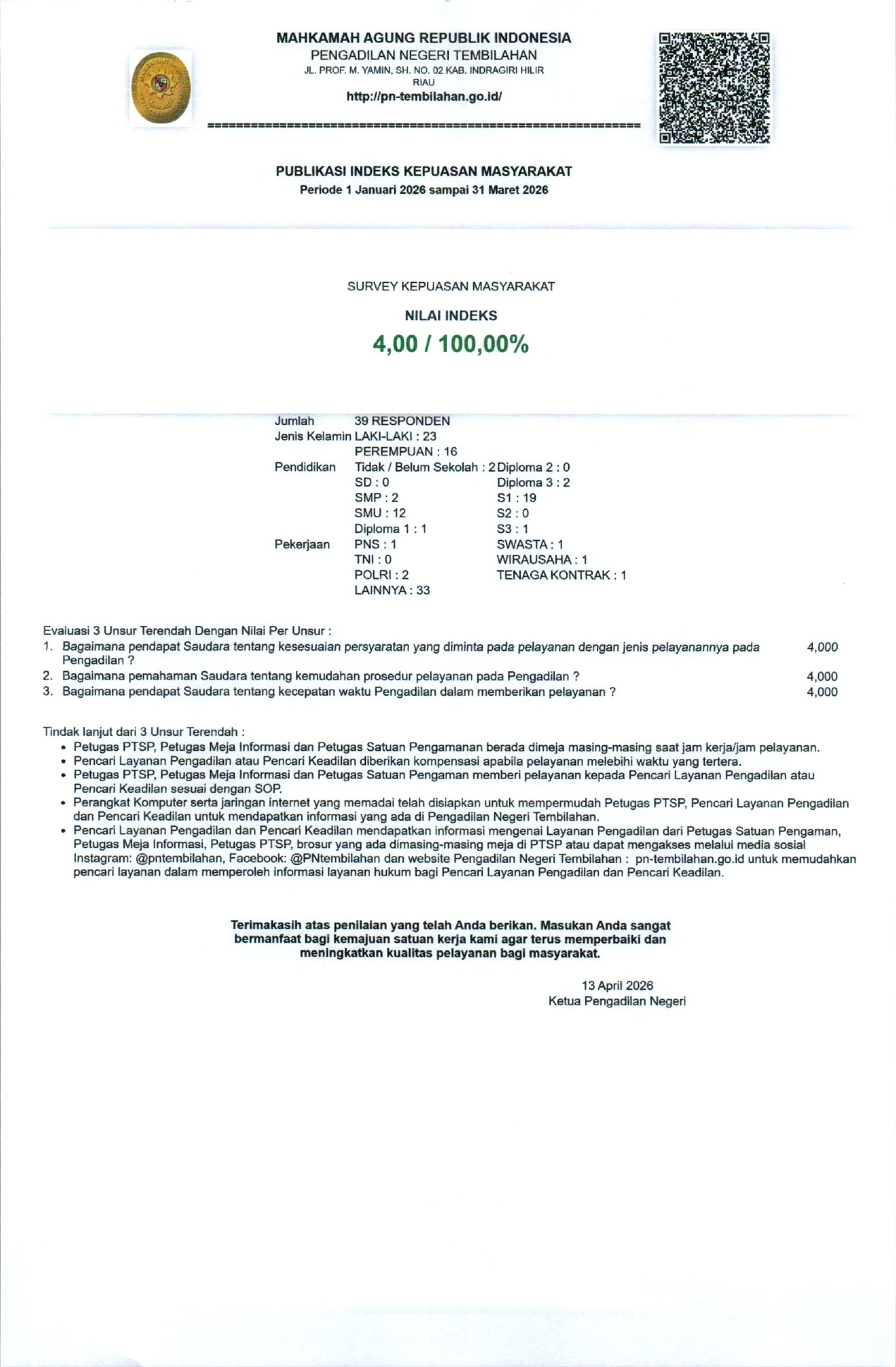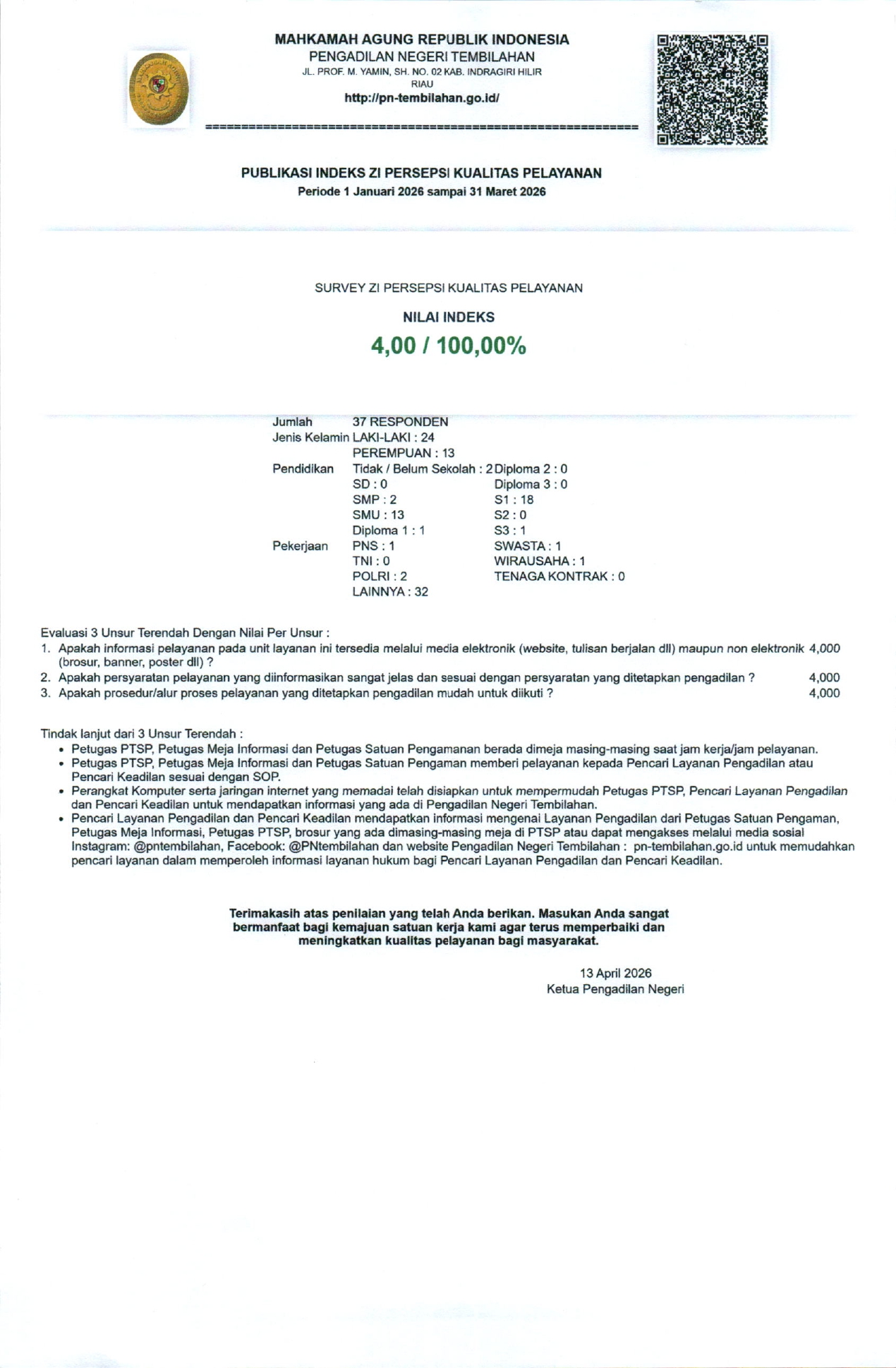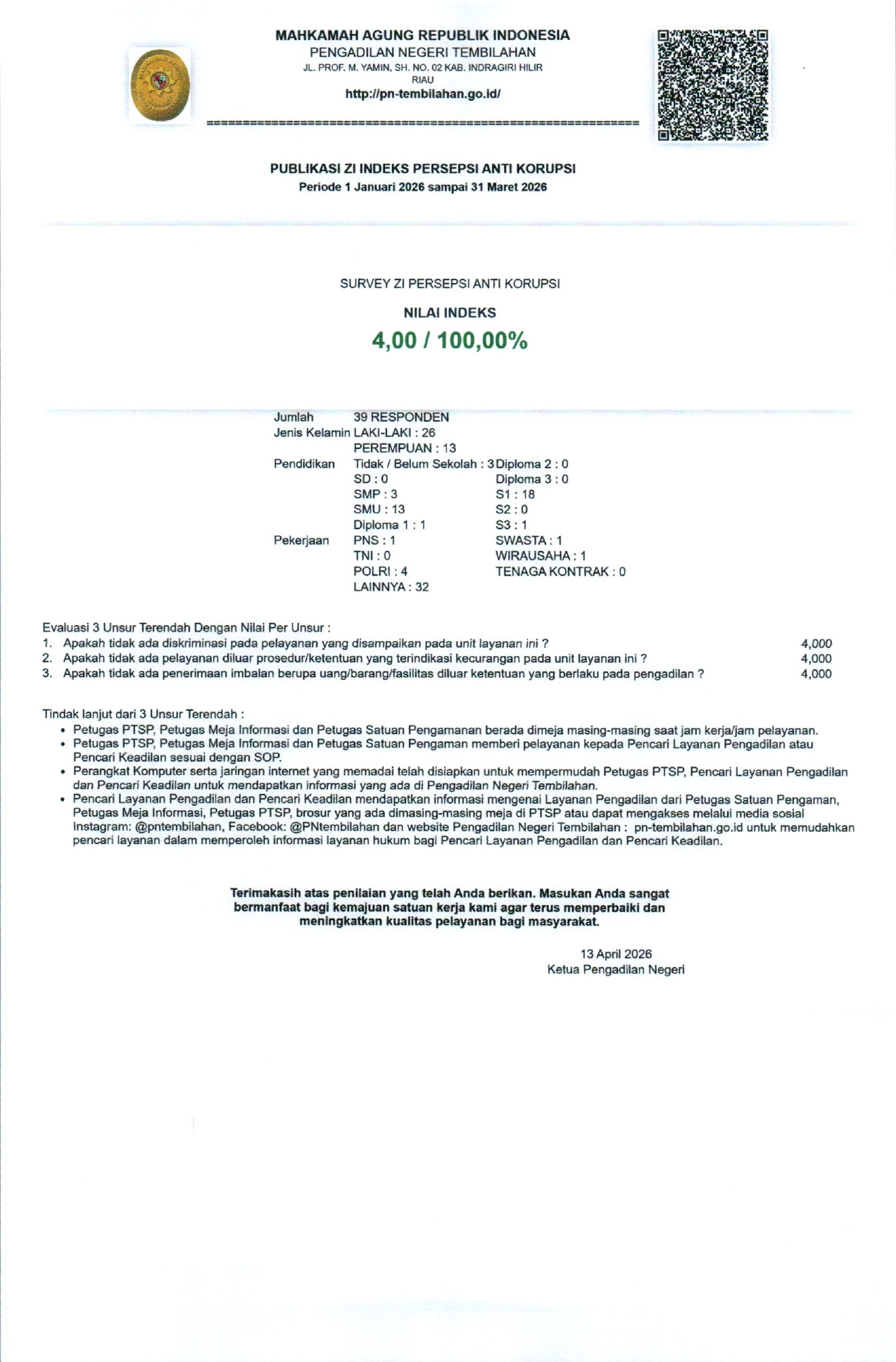 Pada hari Senin, 13 April 2026. Pengadilan Negeri Tembilahan melaksanakan Opening Meeting Asesmen AMPUH. Ini merupakan pembukaan dari serangkaian kegiatan…