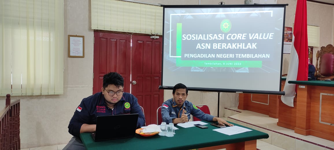 (Rabu, 8 Juni 2022) Bertempat di Ruang Sidang Kartika, Pengadilan Negeri Tembilahan mengadakan Sosialisasi Core Value ASN BerAKHLAK pada Hari Rabu tanggal 8 Juni 2022. Dalam Sosialisasi tersebut dihadiri oleh seluruh Pegawai mulai dari Ketua Pengadilan Negeri Tembilahan yaitu Ibu Hera Polosia Destiny, S.H., M.H, Para Hakim, Sekretaris, pejabat struktural dan pejabat fungsional serta seluruh pegawai di Pengadilan Negeri Tembilahan. Ketua Pengadilan Negeri Tembilahan Hera Polosia Destiny menyampaikan Core Value baru ASN yaitu BerAkhlak.