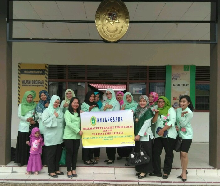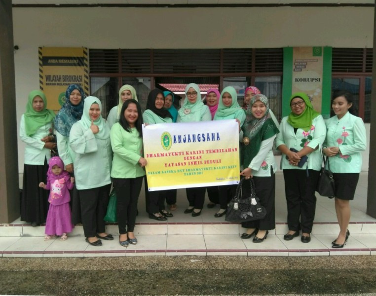 Tembilahan, 13 Oktober 2017.  Dalam rangka HUT Dharmayukti Karini ke- XV tahun 2017,  Pengurus Dharmayukti Karini Cabang Tembilahan melaksanakan rangkaian kegiatan yaitu Anjangsana Ke Yayasan Inhil Peduli  berupa pemberian bantuan sembako kepada anak-anak didik di Yayasan tersebut.  Kegiatan ini disambut gembira oleh anak-anak serta pengurus Yayasan Inhil Peduli.