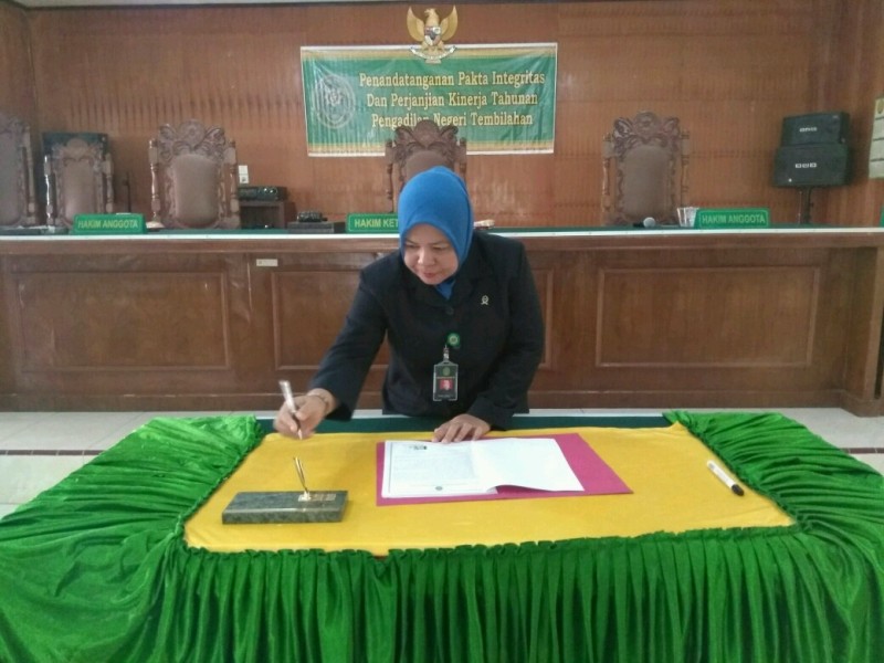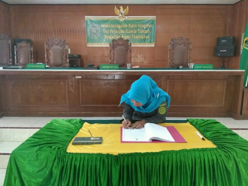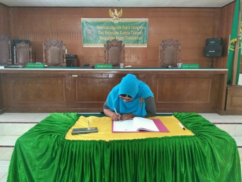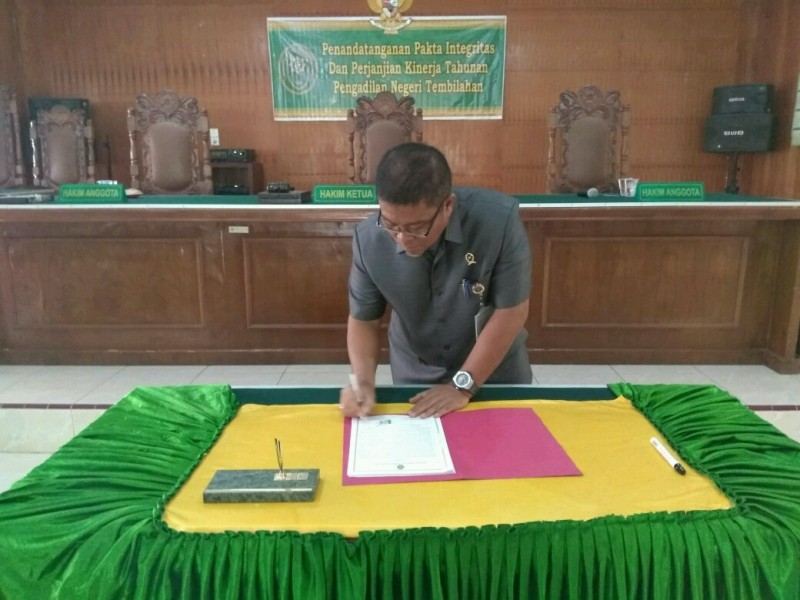 Lalu dilanjutkan penandatanganan Pakta Integritas dengan dimulai dari unsur pimpinan dilanjutkan pejabat struktural, pejabat fungsional, dan para staf Pengadilan Negeri Tembilahan serta Pegawai Tidak Tetap.