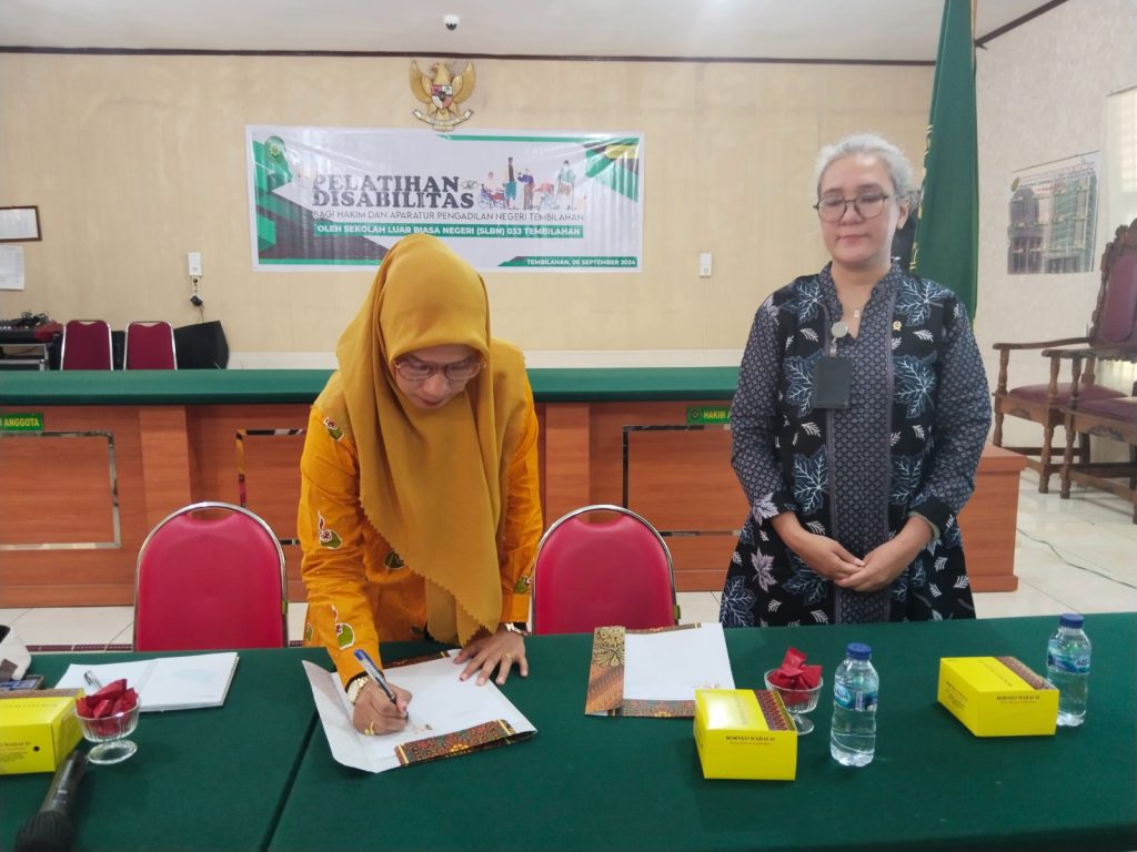 Bertempat diruang sidang kartika Pengadilan Negeri Tembilahan. Dilaksanakan acara Penandatanganan MoU antara Pengadilan Negeri Tembilahan dengan Sekolah Luar Biasa Negeri(SLBN) 033 Tembilahan. Selain itu dilaksanakan juga Pelatihan disabilitas oleh Sekolah Luar Biasa Negeri(SLBN) 033 Tembilahan kepada pegawai Pengadilan Negeri Tembilahan terutama Petugas Pelayanan Terpadu Satu Pintu (PTSP) agar Pengadilan Negeri Tembilahan dapat terus menigkatkan pelayanan bagi kaum disabilitas di Kabupaten Indragiri Hilir.