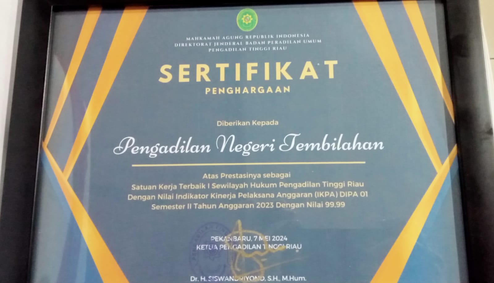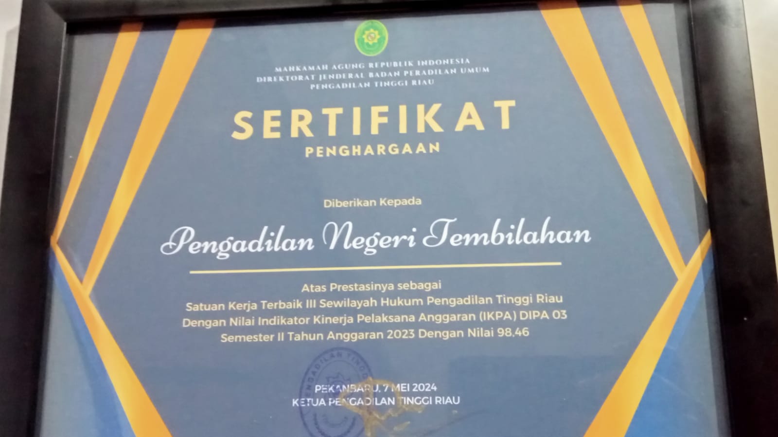 PENGADILAN NEGERI TEMBILAHAN MENERIMA PENGHARGAAN DARI PENGADILAN TINGGI RIAU