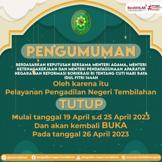 Berdasarkan Keputusan Bersama Menteri Agama, Menteri Ketenagakerjaan dan Menteri Pendayagunaan Aparatur Negara dan Reformasi Borikrasi RI tentang Cuti Hari Raya Idulย Fitriย 1444H Oleh karena itu Pelayanan Pengadilan Negeri Tembilahan Tutup Mulai tanggal 19 April s.dย 25ย Aprilย 2023 Dan akan kembali BUKA Pada tanggal 26 Aprilย 2023. Atas Perhatiannya Kami Ucapkan Terima Kasih