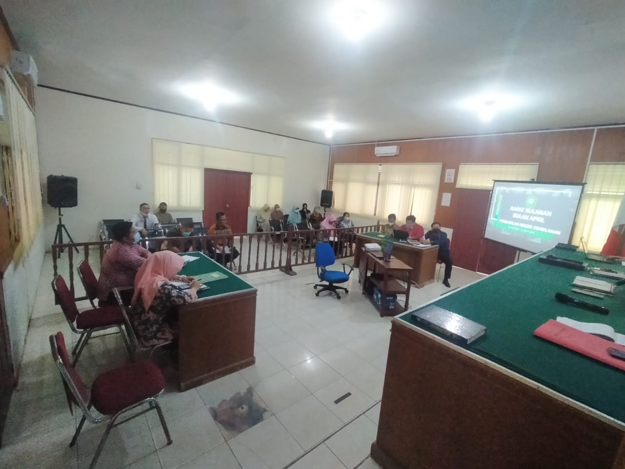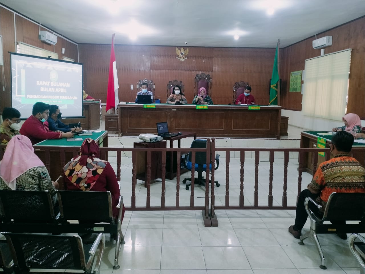 (Kamis, 22 April 2021) Bertempat di Ruang Sidang Kartika, Pengadilan Negeri Tembilahan mengadakan Rapat Bulanan pada Hari Senin tanggal 22 April 2021. Dalam Rapat tersebut dihadiri oleh seluruh Pegawai mulai dari Ketua Pengadilan Negeri Tembilahan yaitu Ibu Nurmala Sinurat, S.H., M.H, Para Hakim, Sekretaris, pejabat struktural dan pejabat fungsional serta seluruh pegawai di Pengadilan Negeri Tembilahan. Rapat di Buka pukul 10.30 dan diakhiri pukul 12.30 WIB.