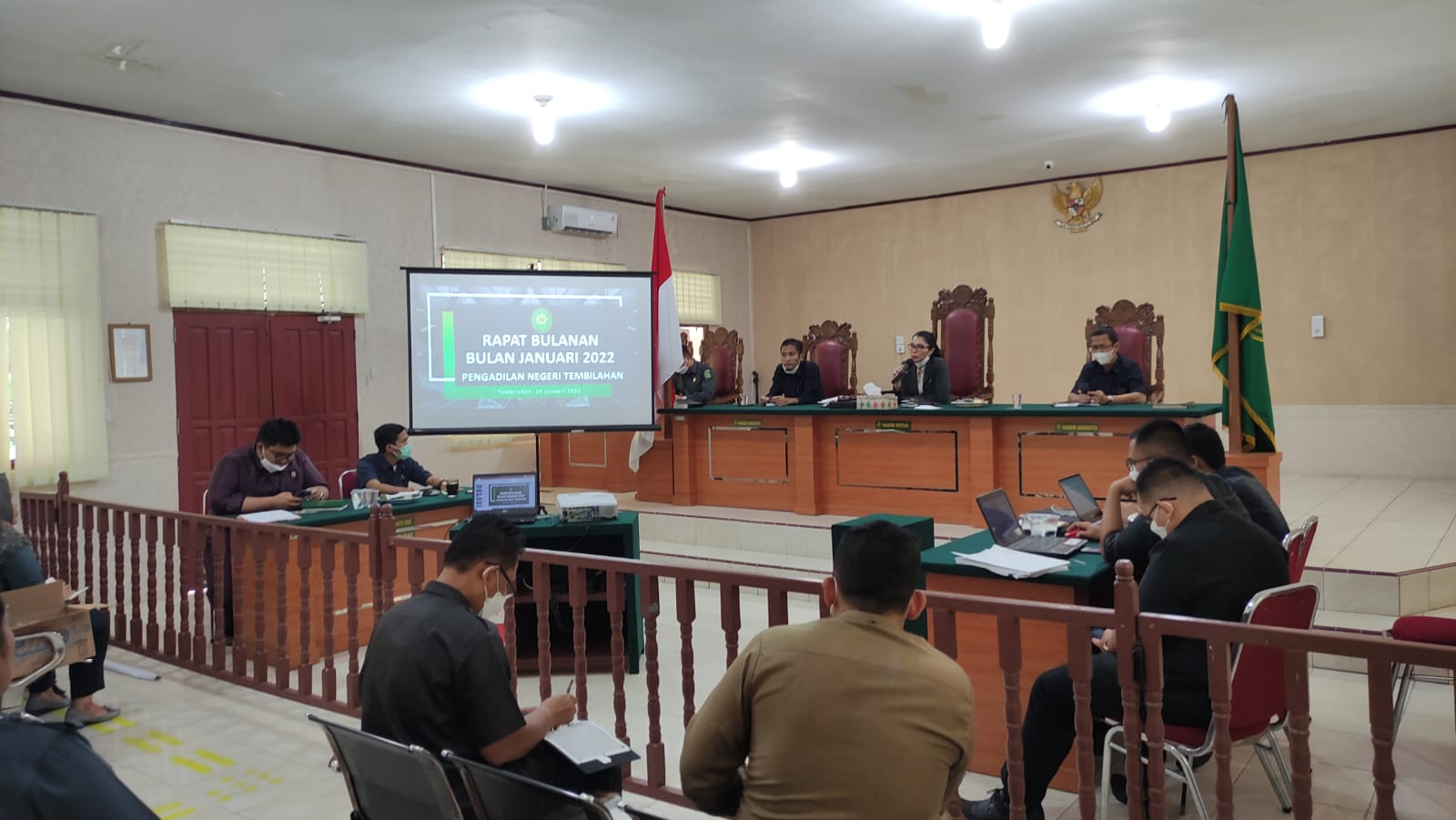 (Rabu, 26 Januari 2022) Bertempat di Ruang Sidang Kartika, Pengadilan Negeri Tembilahan mengadakan Rapat Bulanan Bulan Januari pada Hari Rabu tanggal 22 Januari 2022. Dalam Rapat tersebut dihadiri oleh seluruh Pegawai mulai dari Ketua Pengadilan Negeri Tembilahan yaitu Ibu Hera Polosia Destiny, S.H., M.H, Para Hakim, Sekretaris, pejabat struktural dan pejabat fungsional serta seluruh pegawai di Pengadilan Negeri Tembilahan. Rapat bulanan di Buka pukul 09.00 dan diakhiri pukul 11.00 WIB. Rapat diawali dengan sambutan dan arahan dari Ketua Pengadilan Negeri Tembilahan yang dilanjutkan dengan arahan dari Sekretaris Pengadilan Negeri tembilahan kemudian arahan dari Panitera Pengadilan Negeri Tembilahan. Pembahasan dalam rapat tersebut berfokus mengenai perencanaan Zona Integritas dan evaluasi kinerja di Pengadilan Negeri Tembilahan.