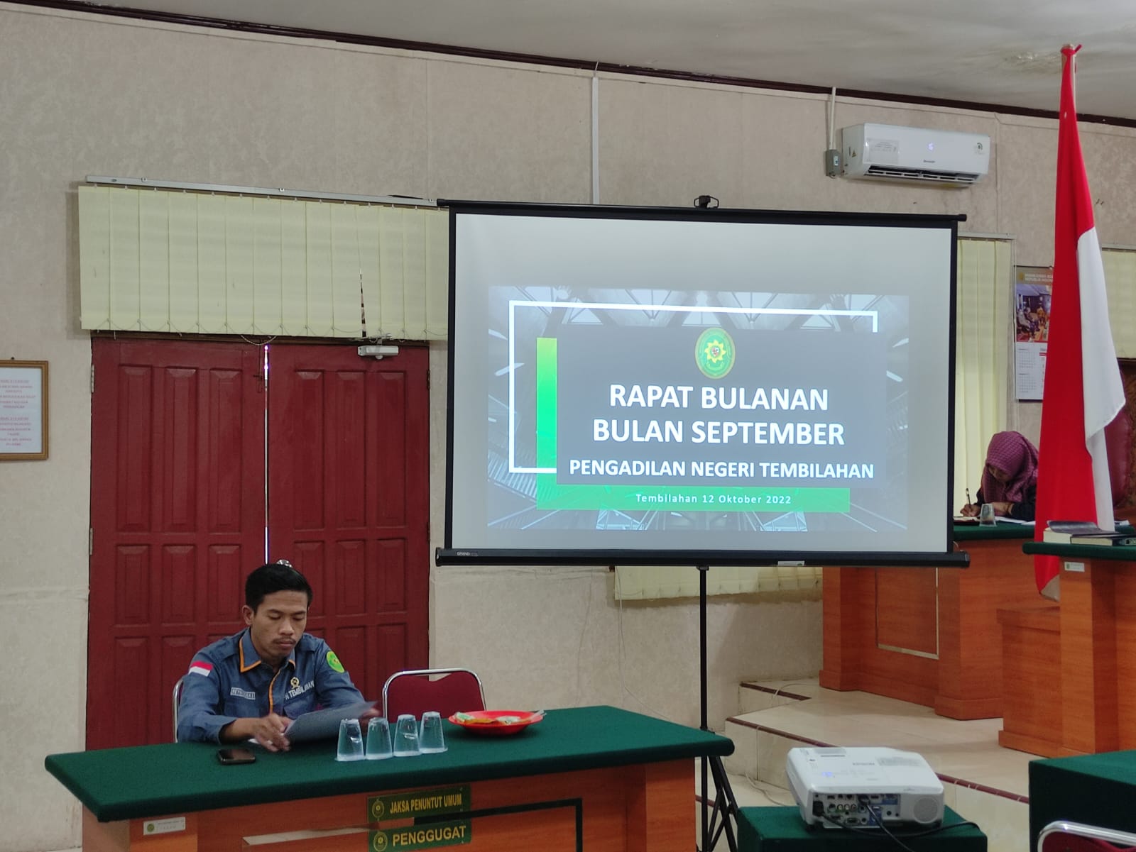(Kamis, 12 Oktober 2022) Bertempat di Ruang Sidang Kartika, Pengadilan Negeri Tembilahan mengadakan Rapat Bulanan Bulan September pada Hari Rabu tanggal 12 Oktober 2022. Dalam Rapat tersebut dihadiri oleh seluruh Pegawai mulai dari Ketua Pengadilan Negeri Tembilahan yaitu Ibu Hera Polosia Destiny, S.H., M.H, Para Hakim, Sekretaris, pejabat struktural dan pejabat fungsional serta seluruh pegawai di Pengadilan Negeri Tembilahan. Rapat bulanan di Buka pukul 08.00 dan diakhiri pukul 12.00 WIB. Rapat diawali dengan sambutan dan arahan dari Ketua Pengadilan Negeri Tembilahan yang dilanjutkan dengan arahan dari Sekretaris Pengadilan Negeri tembilahan kemudian arahan dari Panitera Pengadilan Negeri Tembilahan. Pembahasan dalam rapat tersebut berfokus mengenai review kinerja selama bulan Agustus.