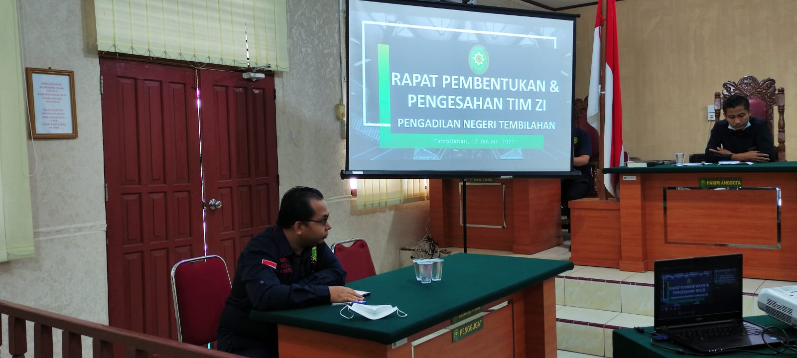 (Rabu, 12 Januari 2022) Bertempat di Ruang Sidang Kartika, Pengadilan Negeri Tembilahan. Diadakan rapat pembentukan dan pengesahan tim zona integritas Dalam Rapat tersebut dihadiri oleh seluruh Pegawai mulai dari Ketua Pengadilan Negeri Tembilahan yaitu Ibu Hera Polosia Destiny, S.H., M.H, Para Hakim, Sekretaris, pejabat struktural dan pejabat fungsional serta seluruh pegawai di Pengadilan Negeri Tembilahan. Rapat bulanan di Buka pukul 09.00 dan diakhiri pukul 11.00 WIB. Rapat diawali dengan sambutan dan arahan dari Ketua Pengadilan Negeri Tembilahan yang dilanjutkan dengan arahan dari Sekretaris Pengadilan Negeri tembilahan kemudian arahan dari Panitera Pengadilan Negeri Tembilahan. Pembahasan dalam rapat adalah penentuan tim zona integritas, penyampaian instruksi KPT Pekanbaru mengenai Zona Integritas.