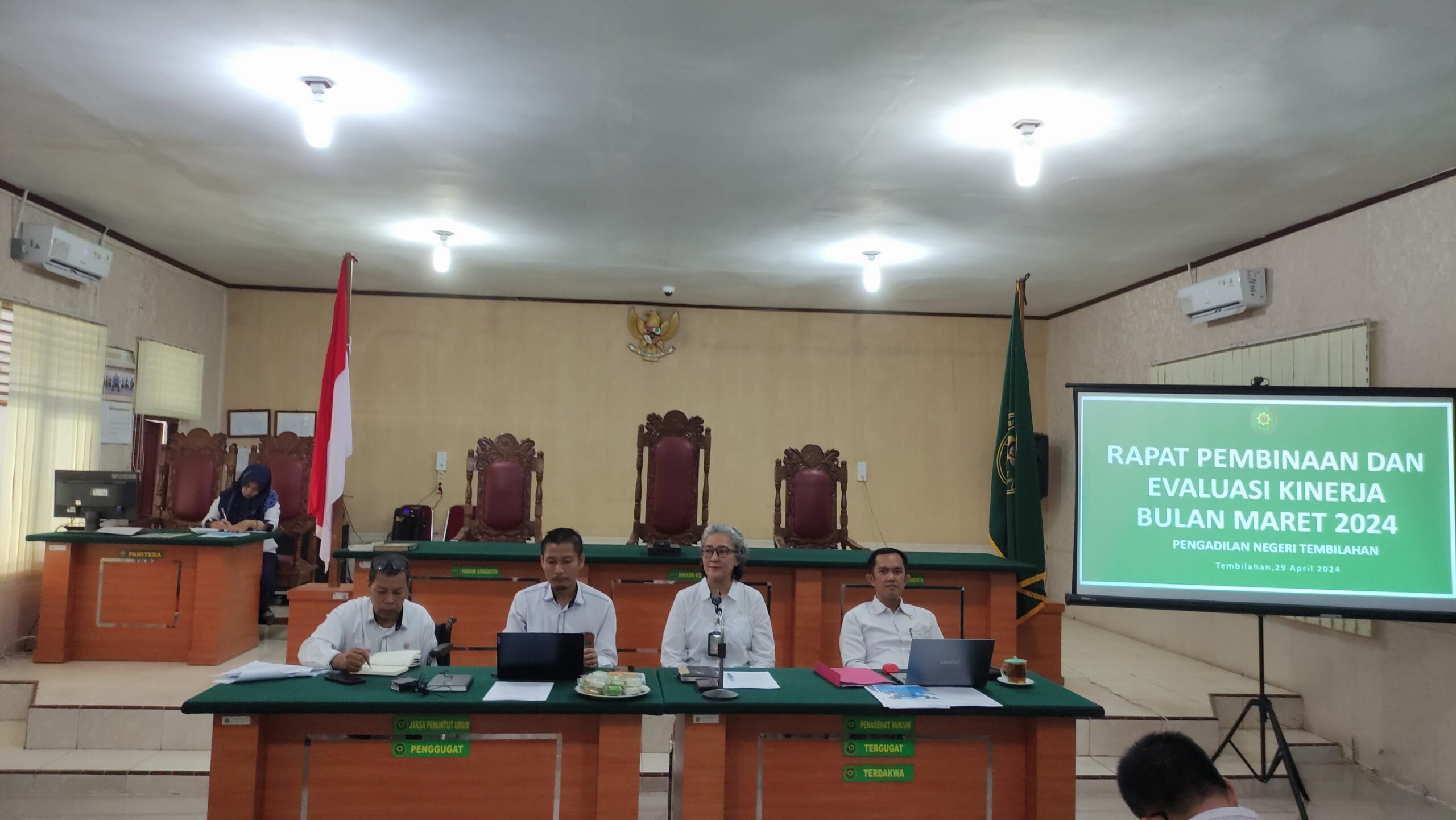 Tembilahan, 29 April 2024. Bertempat di Ruang Sidang Kartika PN Tembilahan dilaksanakan Rapat Pembinaan dan Evaluasi Kinerja Bulan Maret 2024, Acara dimulai dengan menyanyikan Lagu Indonesia Raya, Hymne Mahkamah Agung dan Yel-Yel AMPUH, dan dilanjutkan dengan pembacaan hasil laporan Hakim Pengawas Bidang pada masing-masing bagian. dilanjutkan dengan pembinaan dari Ketua PN Tembilahan, Ibu Aurora Quintina, S.H., M.H., dilanjutkan dengan pengarahan dari Wakil Ketua PN Tembilahan bapak H. Jeily Syahputra, S.H., S.E., M.H sekaligus mensosialisasikan Perma Nomor 7, 8, dan 9 tahun 2016. Setelah itu acara dilanjutkan dengan mendengarkan beberapa pengarahan dari Bapak Sekretaris. Acara diakhiri dengan menyanyikan lagu padamu negeri dan ditutup dengan doa.