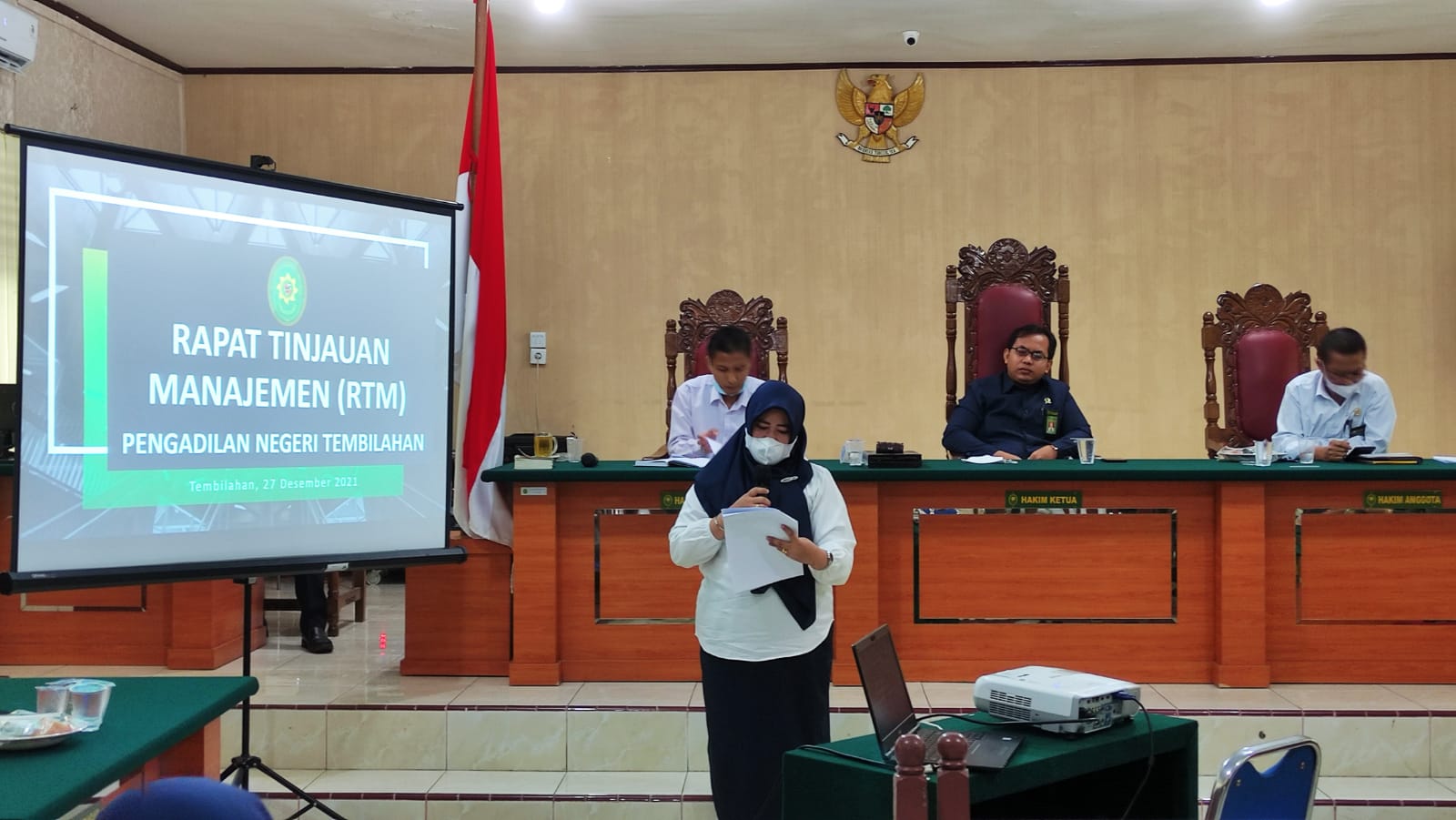 (Senin, 27 Desember 2021) Bertempat di Ruang Sidang Kartika, Pengadilan Negeri Tembilahan mengadakan Rapat Tinjauan Manajemen (RTM) pada Hari Senin tanggal 27 Desember 2021. Dalam Rapat tersebut dihadiri oleh seluruh Pegawai mulai dari Ketua Pengadilan Negeri Tembilahan yaitu Ibu Hera Polosia Destiny, S.H., M.H, Para Hakim, Sekretaris, pejabat struktural dan pejabat fungsional serta seluruh pegawai di Pengadilan Negeri Tembilahan. Rapat bulanan di Buka pukul 10.00 dan diakhiri pukul 11.30 WIB. Rapat diawali dengan sambutan dari QMR Pengadilan Negeri Tembilahan. Dalam rapat tersebut masing-masing bagian yang telah diaudit mempresentasikan temuan dan hasil tindak lanjut dari temuan tersebut.