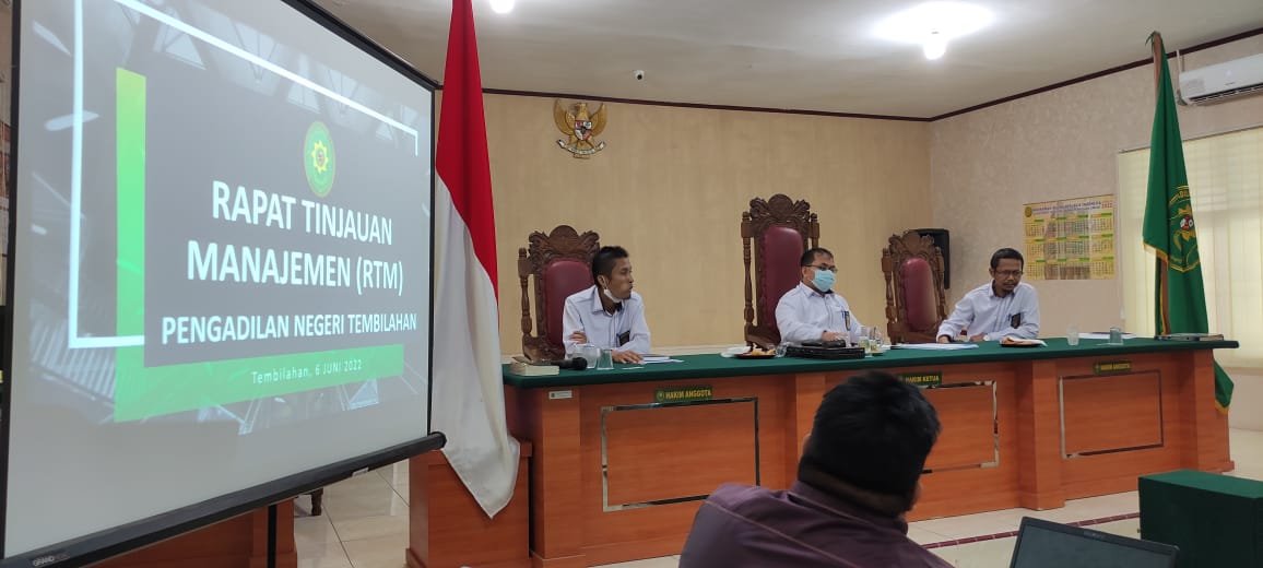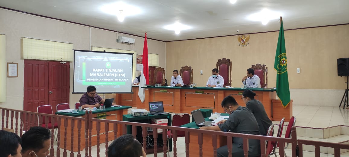 (Senin, 6 Juni 2022) Bertempat di Ruang Sidang Kartika, Pengadilan Negeri Tembilahan mengadakan Rapat Tinjauan Manajemen (RTM) pada Hari Senin tanggal 6 Juni 2021. Dalam Rapat tersebut dihadiri oleh seluruh Pegawai mulai dari Ketua Pengadilan Negeri Tembilahan yaitu Ibu Hera Polosia Destiny, S.H., M.H, Para Hakim, Sekretaris, pejabat struktural dan pejabat fungsional serta seluruh pegawai di Pengadilan Negeri Tembilahan. Rapat bulanan di Buka pukul 10.00 dan diakhiri pukul 11.30 WIB. Rapat diawali dengan sambutan dari QMR Pengadilan Negeri Tembilahan. Dalam rapat tersebut masing-masing bagian yang telah diaudit mempresentasikan temuan dan hasil tindak lanjut dari temuan tersebut.