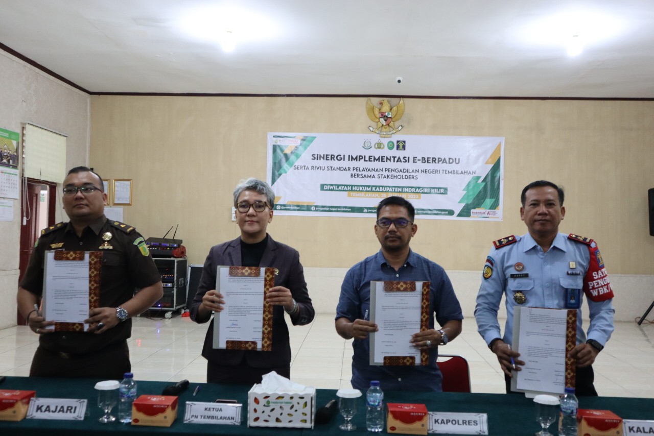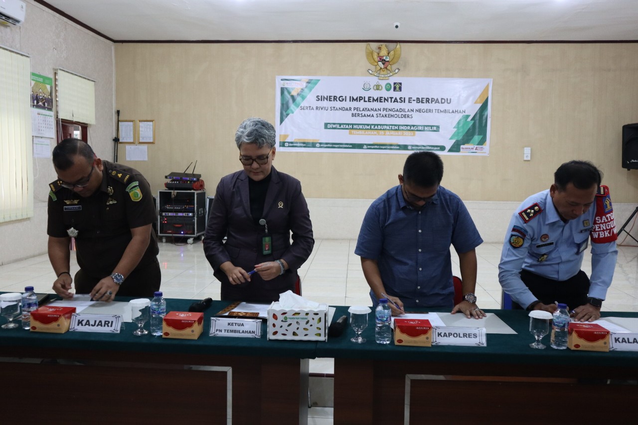 Tembilahan, 25 Januari 2023. Bertempat di ruang sidang Kartika Pengadilan Negeri Tembilahan. Diadakan Penandatanganan Perjanjian Kerjasama (PKS) antara Aparat Penegak Hukum di wilayah hukum Pengadilan Negeri Tembilahan yang bertema “Sinergi Implementasi E-Berpadu”. Selain penandatanganan perjanjian Kerjasama, Pengadilan Negeri Tembilahan memanfaatkan kesempatan ini untuk melakukan riviu standar pelayanan Pengadilan selama ini dengan mendengarkan feedback dari para Stakeholders.