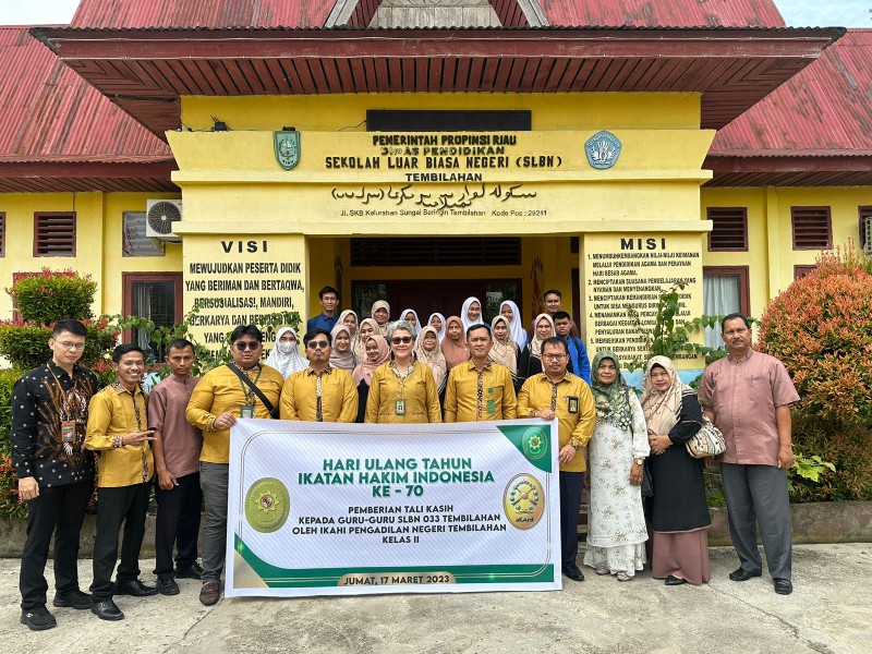 Ikahi Pengadilan Negeri Tembilahan Menyelenggarakan tali kasih bagi Guru – Guru Sekolah Luar Biasa Negeri (SLBN) 033 Tembilahan berupa sembako. Acara tersebut dilakukan untuk memperingati HUT IKAHI ke-70. Acara tersebut di hadiri Oleh Ketua Pengadilan Negeri Tembilahan Yaitu Ibu Aurora Quintina S.H., M.H. Bapak Wakil Pengadilan Negeri Tembilahan Jeily Syahputra S.H., S, E., M.H. Serta seluruh Hakim IKAHI cabang tembilahan.